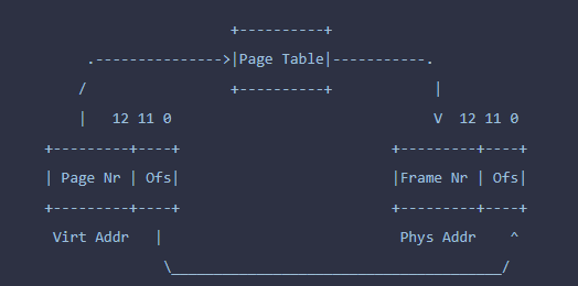아래 그림은 페이지들과 프레임들의 관계를 보여준다. 왼쪽의 가상 주소는 page number와 offset으로 구성된다. 페이지 테이블은 페이지 번호를 프레임 번호로 변환하며, 오른쪽에 물리 주소를 얻기 위해 수정되지 않은 offset과 결합된다.