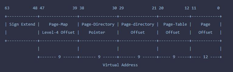 가상 페이지라고도 불리는 page는 가상 메모리의 연속적인 영역이며, 페이지 사이즈는 4,096 bytes이다. 페이지는 페이지 크기로 균등하게 나눌 수 있는 가상 주소에서 시작해야 한다. 따라서 64비트 가상 주소의 마지막 12비트는 page offset이다. 그 위의 비트는 페이지 테이블의 인덱스를 나타내는 데 사용된다. 64비트 시스템에서 우리는 4-level-page table을 사용한다.