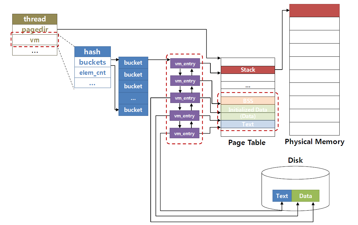 위의 그림처럼 기존 pintos의 가상 주소 공간 초기화 과정은 디스크로부터 ELF이미지의 세그먼트를 물리메로리로 읽어들인다(load_segment()로 data, code 세그먼트를 읽고, setup_stack()로 스택에 물리페이지를 할당한다.).